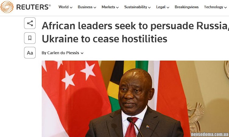 - "Мирний план" Африки передбачає переговори з РФ без виведення окупантів з України, — представник президента ПАР.