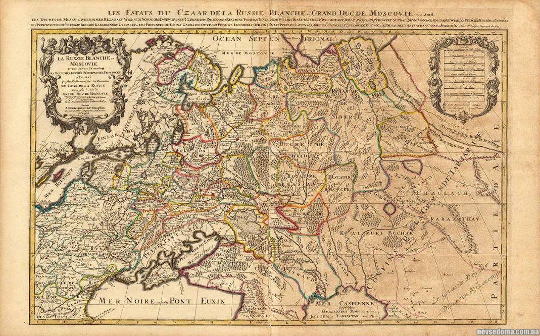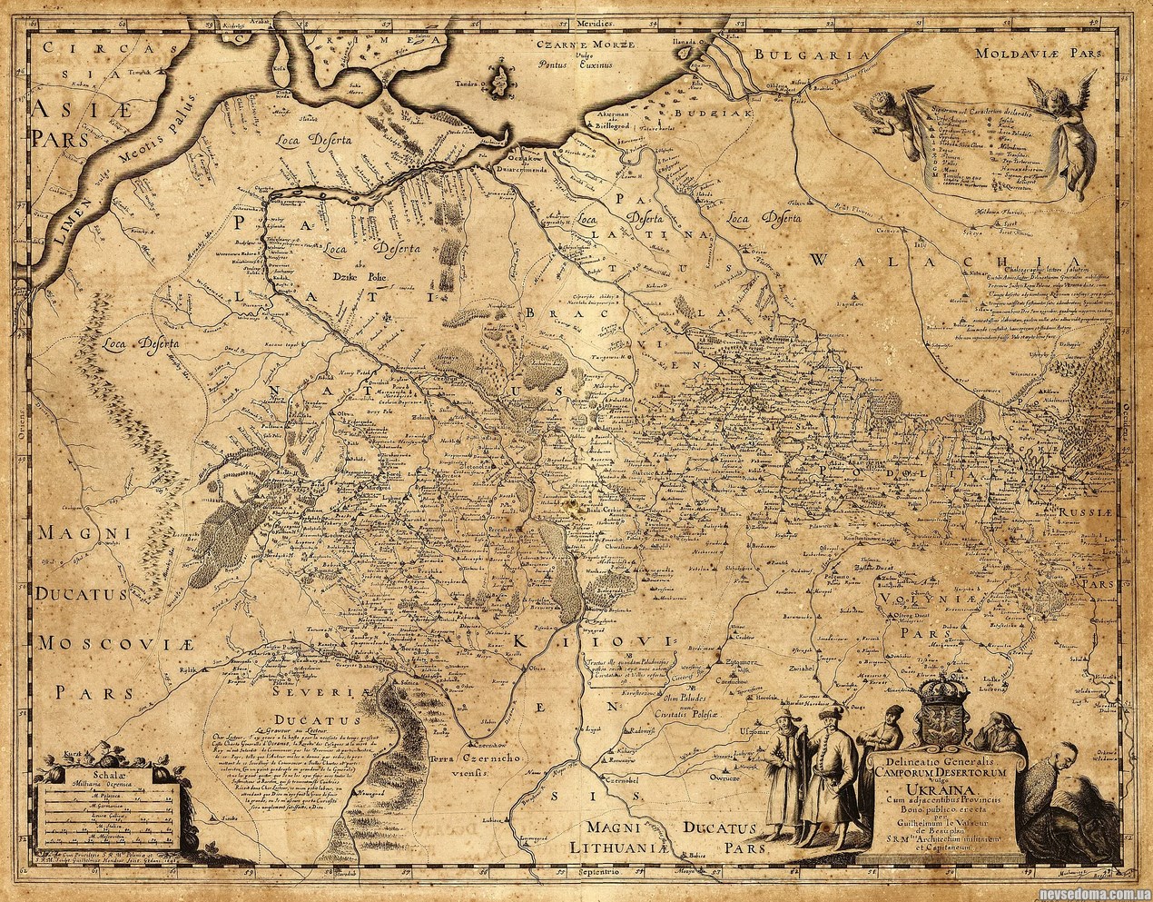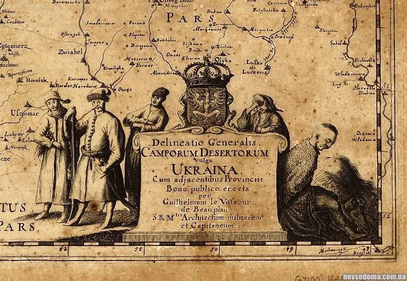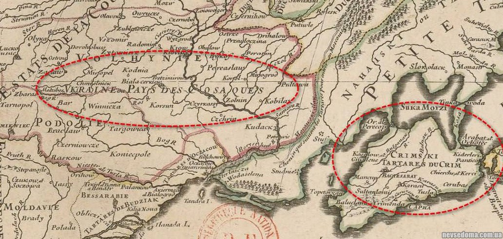 ➡️ Землі, які входять до складу сучасної України, позначені там як Vkraine pays des cosaques (Україна – земля козаків). На той час вона була частиною Речі Посполитої.