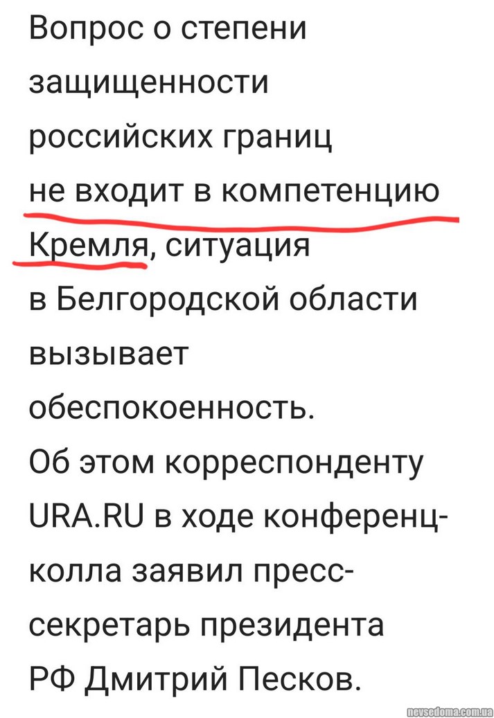 Кремлівський спікер Пєсков «важко відповісти» на питання, чому вже більше доби продовжується «зачистка» Білгородській області від нападників, перенаправивши питання до правоохоронних органів, МО та ФСБ.