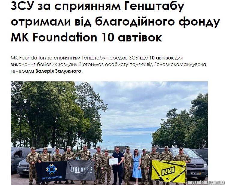 - БФ MK Foundation разом з NAVI та розробниками гри S.T.A.L.K.E.R. за сприяння Генштабу забезпечили армію машинами