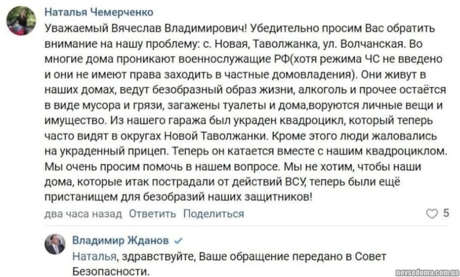 - Шебекінці-нові таволжани скаржаться, що російські військові грабують їхні будинки і гадять там. Хто б сумнівався