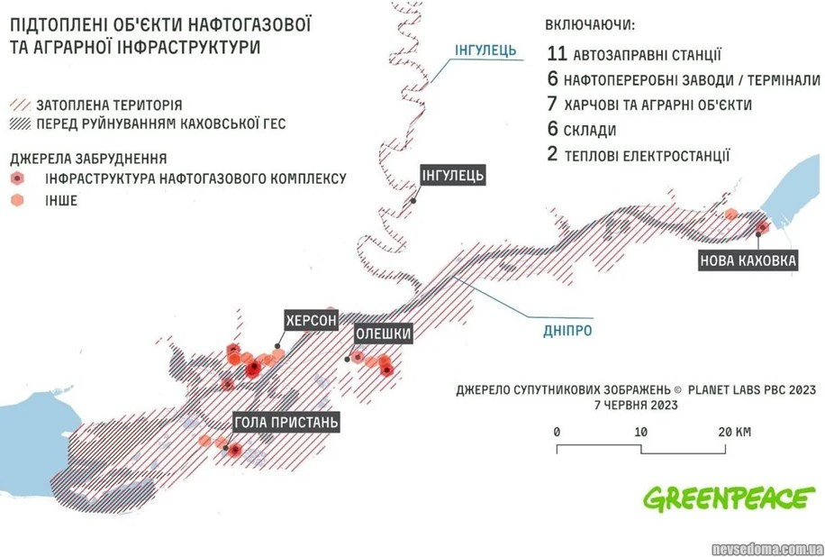 Супутникові дані, проаналізовані Greenpeace, показують, що в результаті підтоплення було зачеплено 32 нафтопереробні заводи, автозаправні станції, теплоелектростанції та склад.