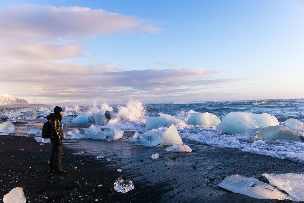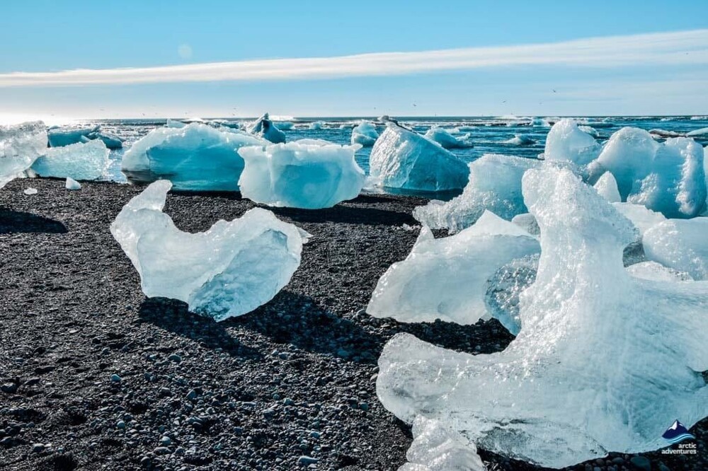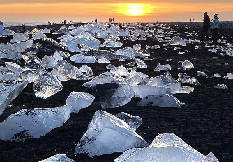 Але сам по собі лід не надто цікавий. Туристів із різних країн на Алмазний пляж притягує саме дивовижне поєднання прозорість «алмазів», холодна блакитність моря і строга окантування чорного вулканічного піску.