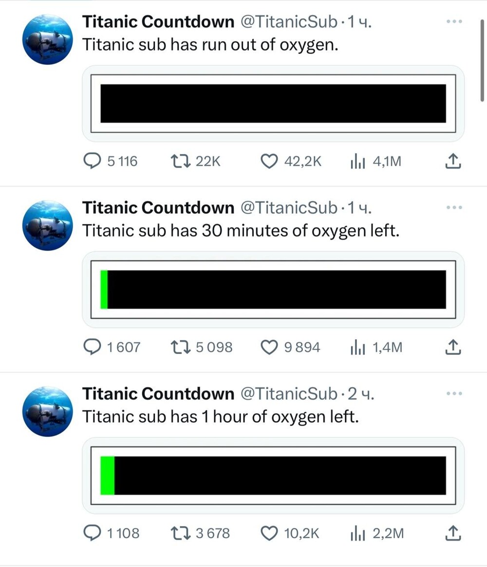 Хтось навіть створив у "Твіттері" сторінку, яка щогодини відміряє залишок повітря на "Титані".
