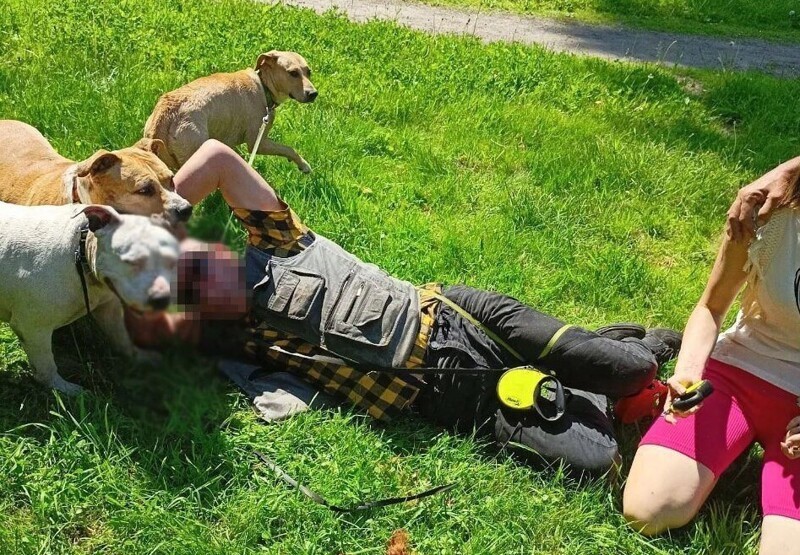 3 агресивних пса розірвали цуценя на руках хазяйки, що кричить, поки їх господар лежав на траві (3 фото + 1 відео)