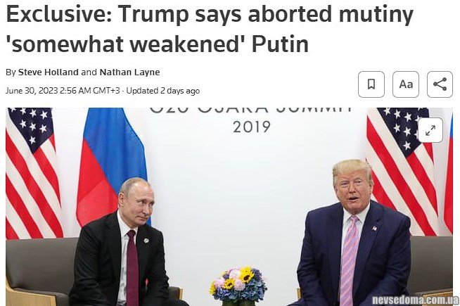 "Українці могли (https://www.reuters.com/world/china/trump-longtime-admirer-putin-says-aborted-mutiny-somewhat-weakened-russian-2023-06-29/) залишити собі значну частину земель, що відвоювали, і Росія на це погодилася б", — заявив екс-президент США.