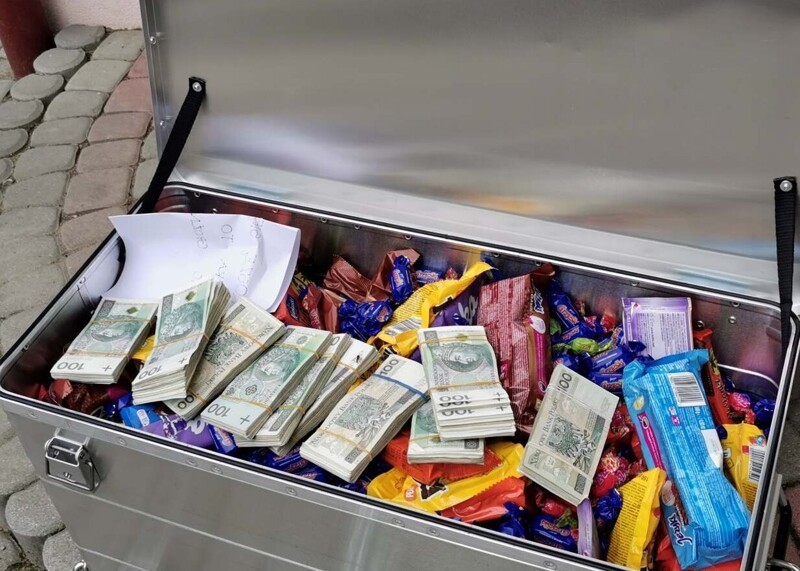 Поліцейські, що прибули, розкрили кейс і виявили в ньому солодощі і 100 тисяч злотих.