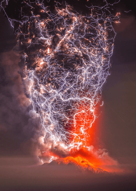 Фотографія удару блискавки в вулкан, що вивергається.