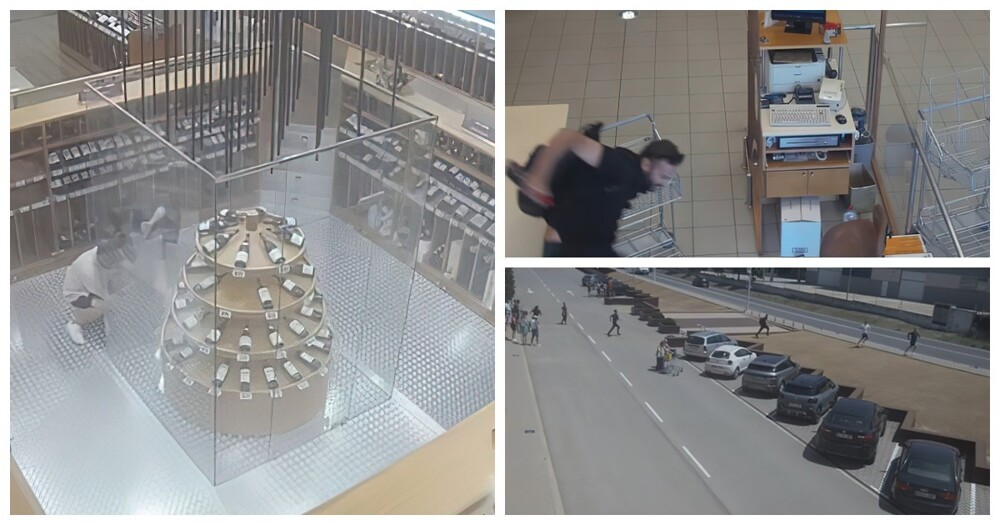 На кадрах із камер відеоспостереження видно, що все грабіжників було троє. Двоє з них підійшли до своєї мети – високого скляному сховищу - з різних боків. Один злодій витягнув з-за пояса другого невеликий ломик, а другий тим часом знову ж таки з широких штанін дістав вакуумну присоску високого тиску. Вони вдвох дуже швидко відчинили двері сховища і в цей момент ніби випадково до них підійшов третій грабіжник і почав складати пляшки до рюкзака. Всі розписано як за нотами.