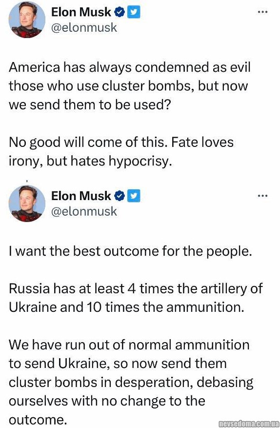 - Ілон Маск про постачання касетних боєприпасів Україні зі США: