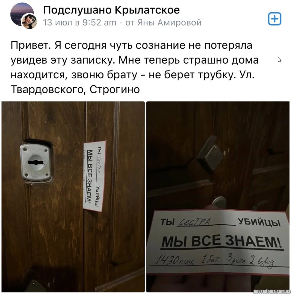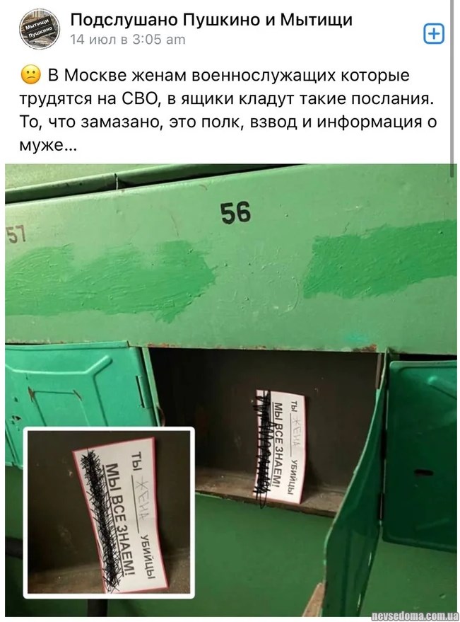 - «Ти дружина вбивці. Ми всі знаємо» — у московських пабликах почали скаржитися на такі записки, нібито надсиланих родичам російських військових