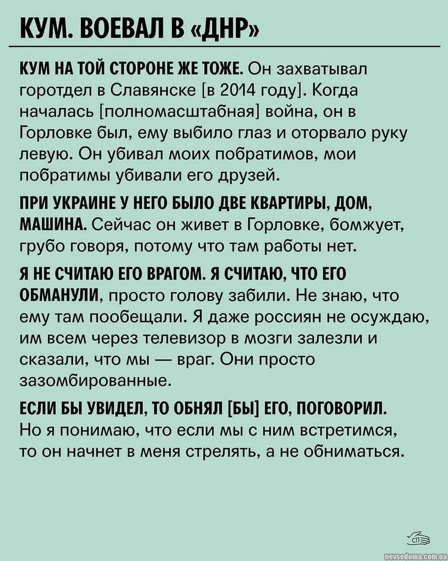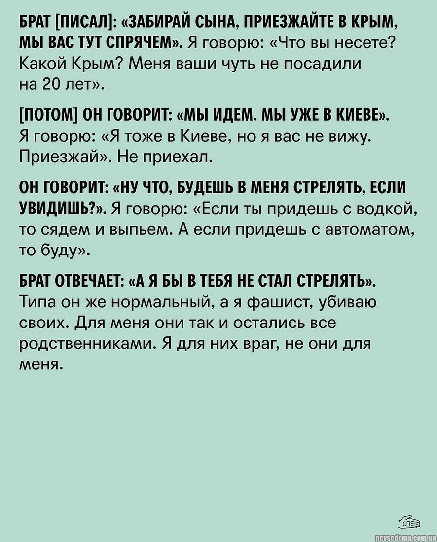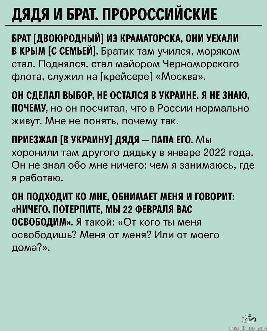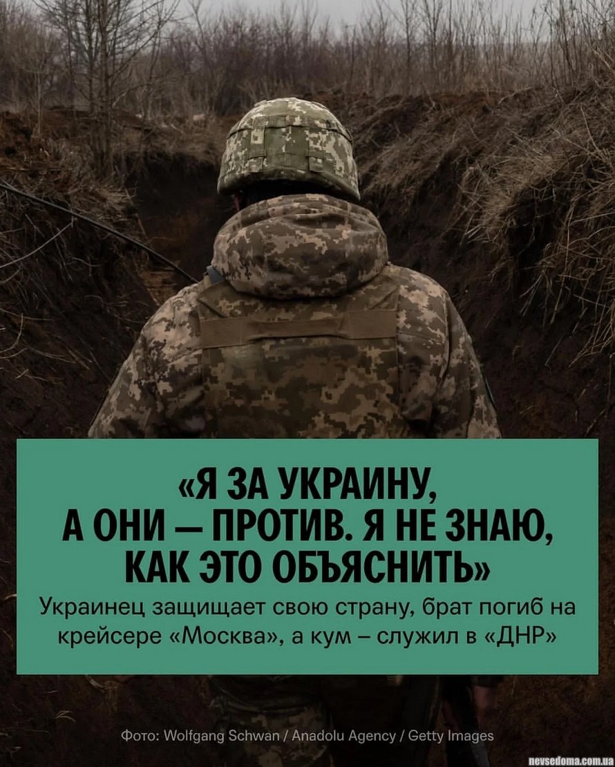 - "Я за Україну. А вони проти". Українець захищає свою країну, але його родичі мають проросійську позицію: брат загинув на крейсері "Москва", кум служив у "ДНР"