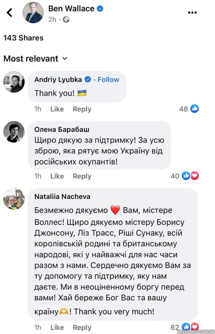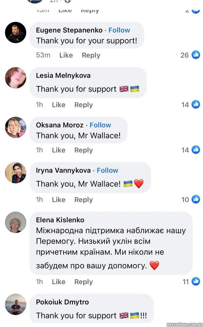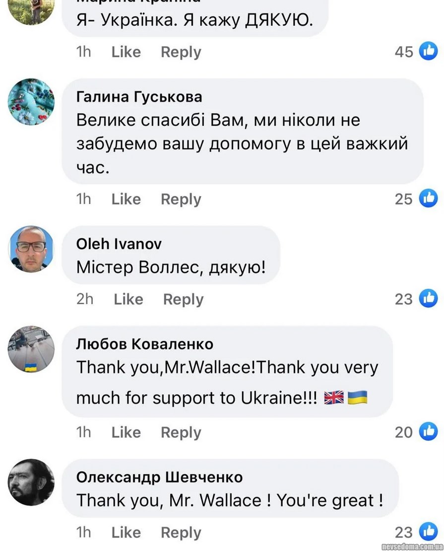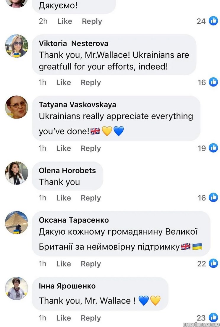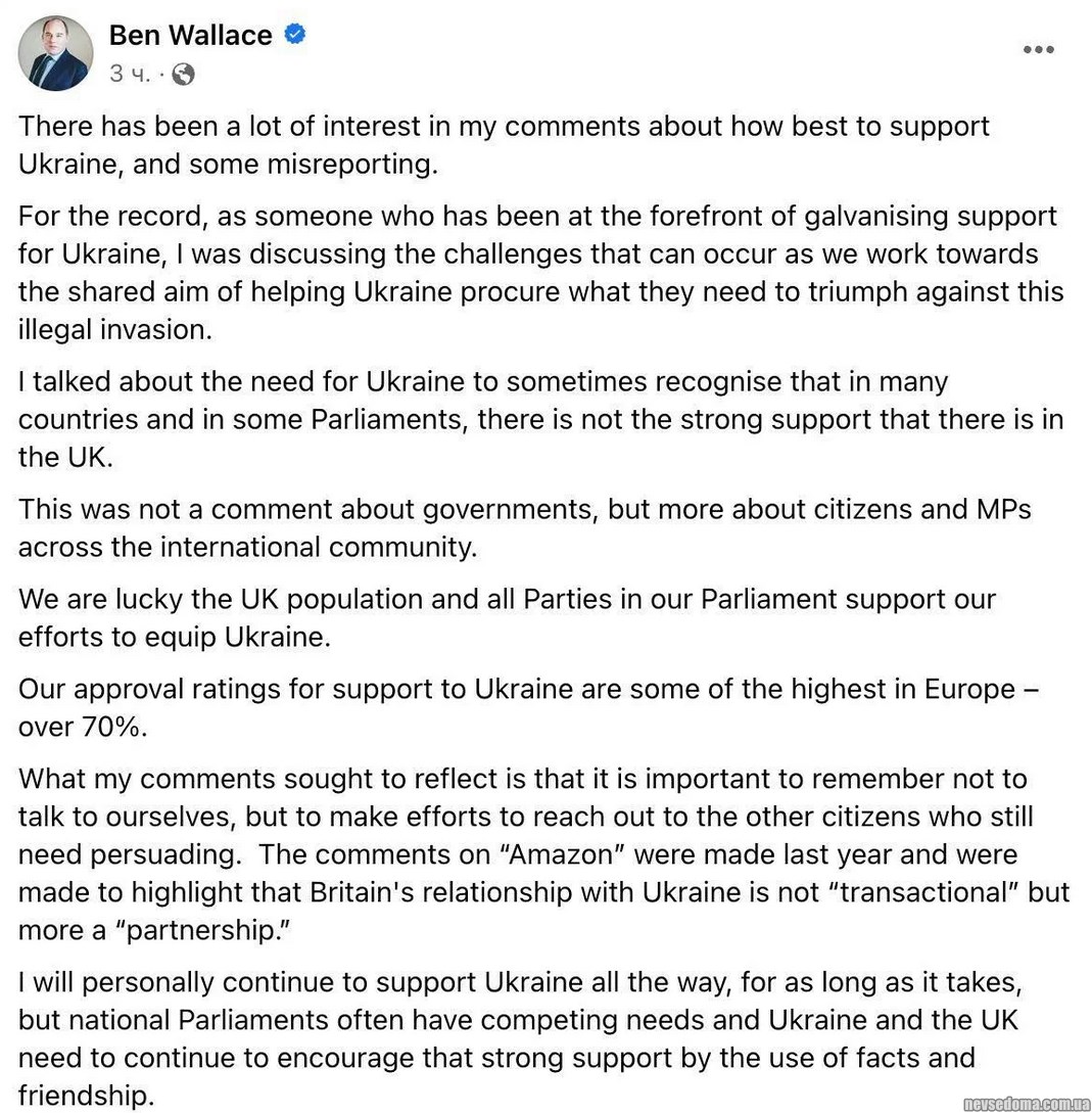 - Міністр оборони Британії Бен Уоллес заявив, що його слова про подяку західним партнерам вирвали з контексту, а він сам продовжуватиме підтримувати Україну стільки, скільки буде потрібно