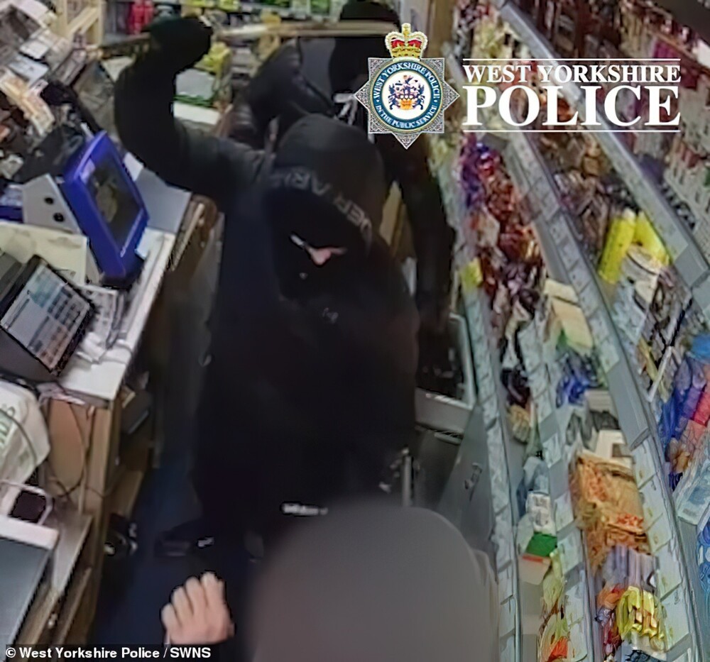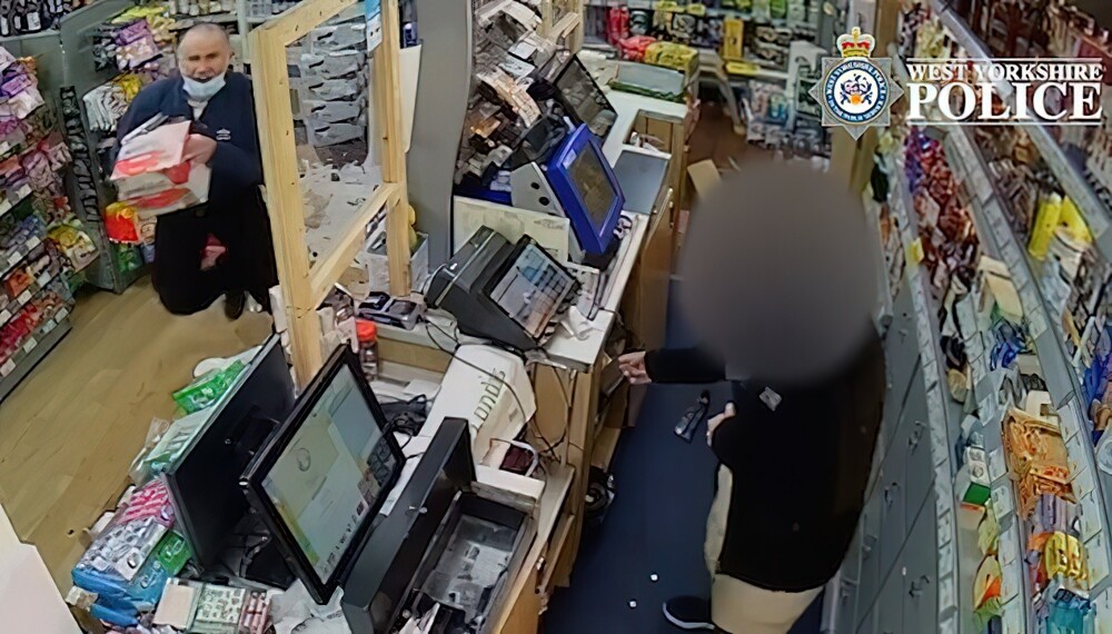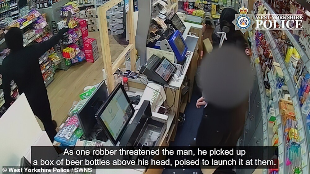 Драматичні кадри показують момент, коли безбаштовий герой-одинак прогнав озброєних грабіжників з магазину в Лідсі, кинувши у них ящик пива.