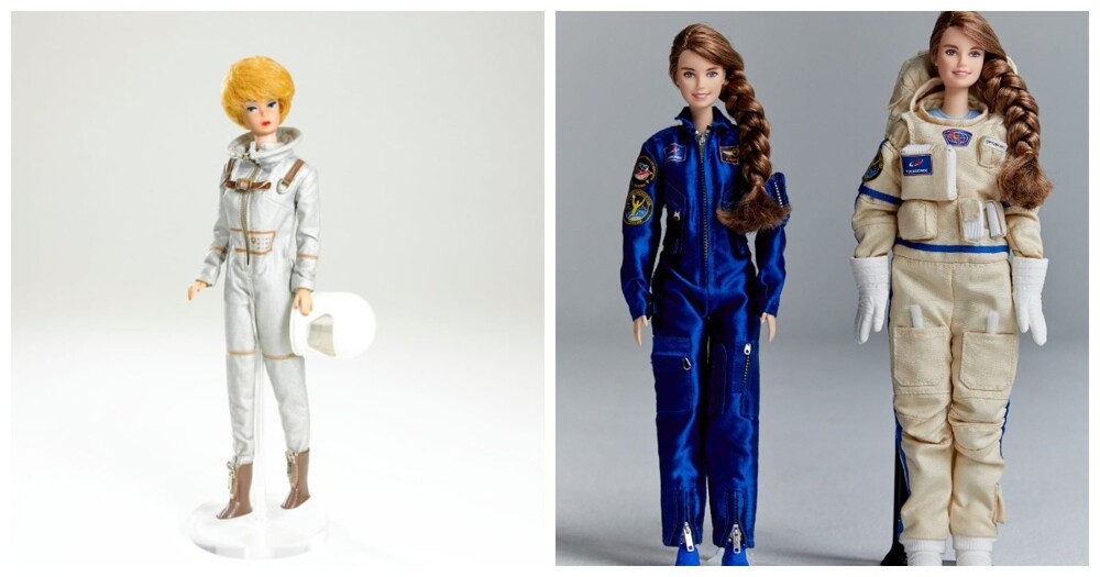 Ліворуч космічна Барбі 1965 року, а справа модель Барбі у скафандрі "Роскосмосу", випущена в 2021 році