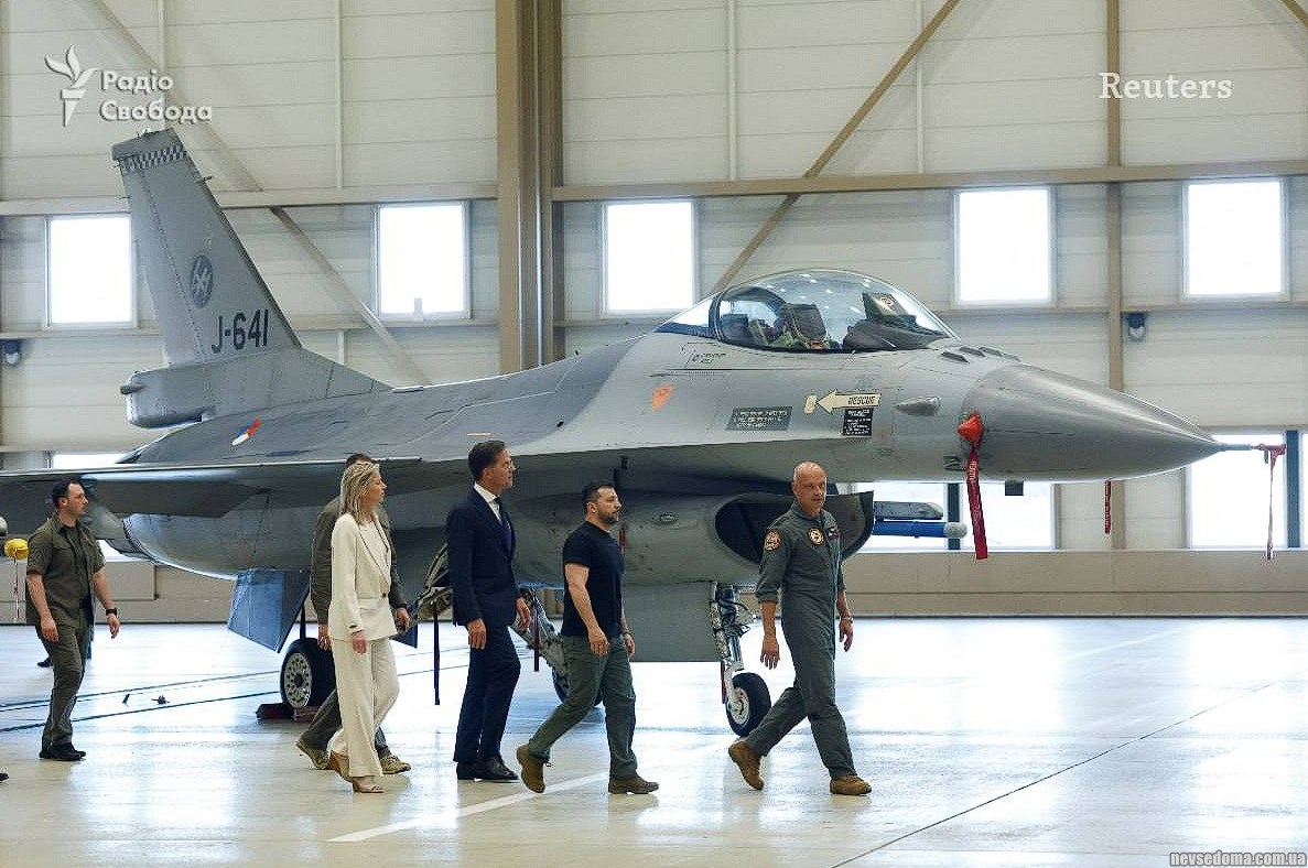 - Президент України Зеленський та прем'єр-міністр Нідерландів Марк Рютте біля RNLAF F-16 на військовій авіабазі в Ейндховені, Нідерланди