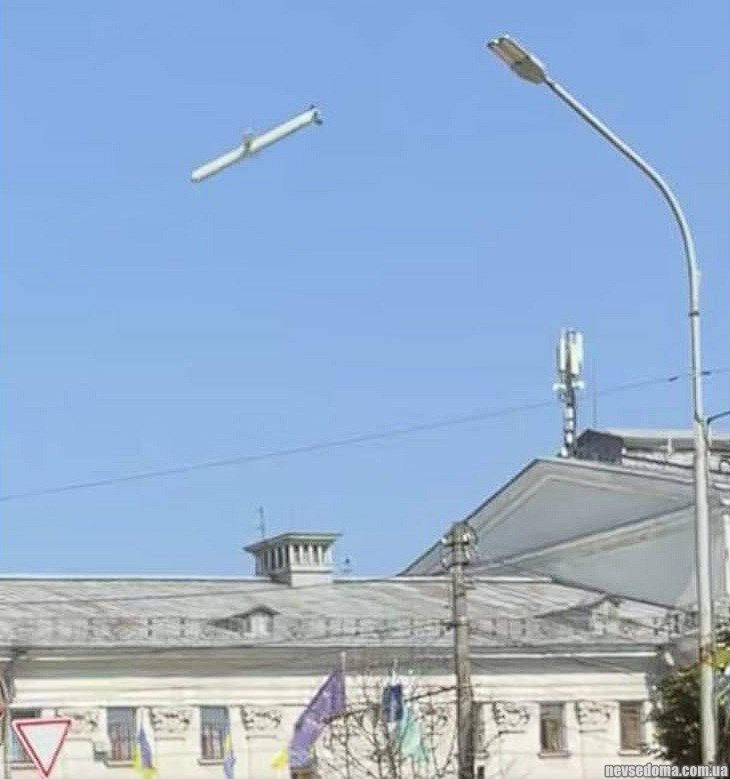 - Фотографія російської крилатої ракети Р-500 (9М728) незадовго до потрапляння до будівлі Драматичного театру у Чернігові у суботу.