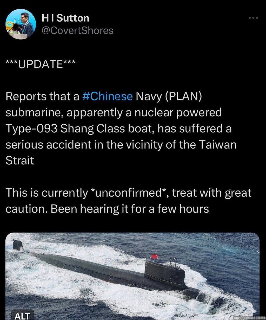 - У кількох повідомленнях стверджується, що підводний човен ВМС Китаю (за чутками, атомний човен типу 093 класу Шан) зазнав серйозної аварії в районі Тайванської протоки.