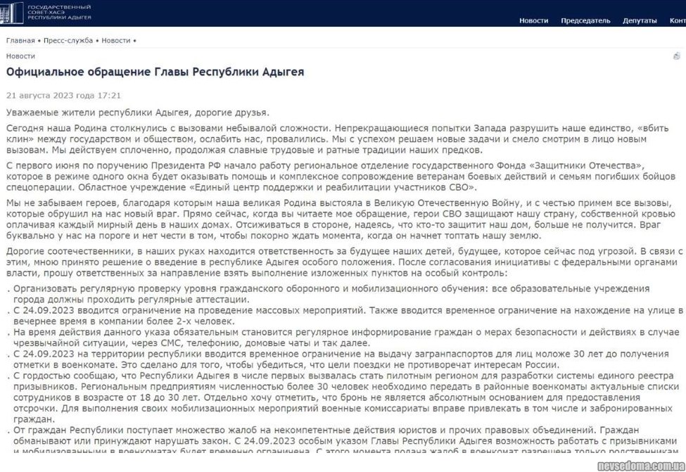 На сайті Державної ради Адигеї з'явилося повідомлення про заборону на виїзд чоловіків призовного віку за межі регіону без дозволу військкомату. Пізніше повідомлення було видалено.