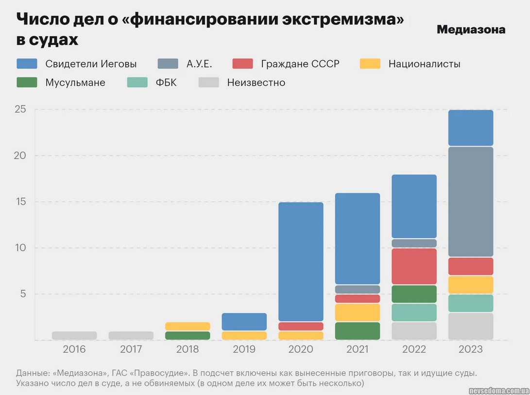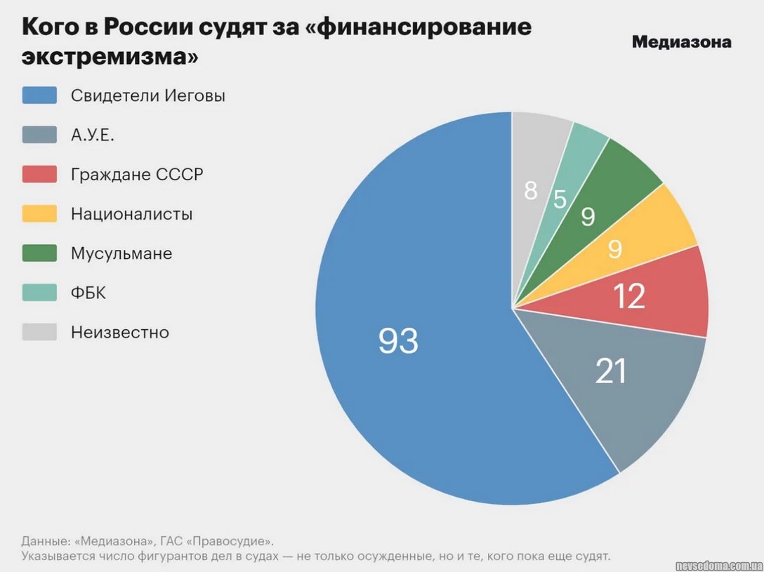 - Медіазону: За «фінансування екстремізму» найчастіше карали «Свідків Єгови», адептів А.У.Є. та «Громадян СРСР»