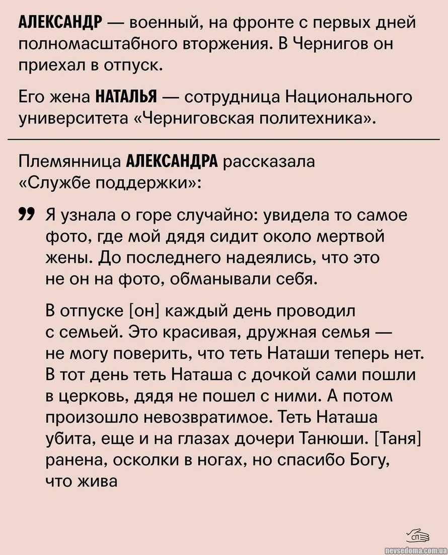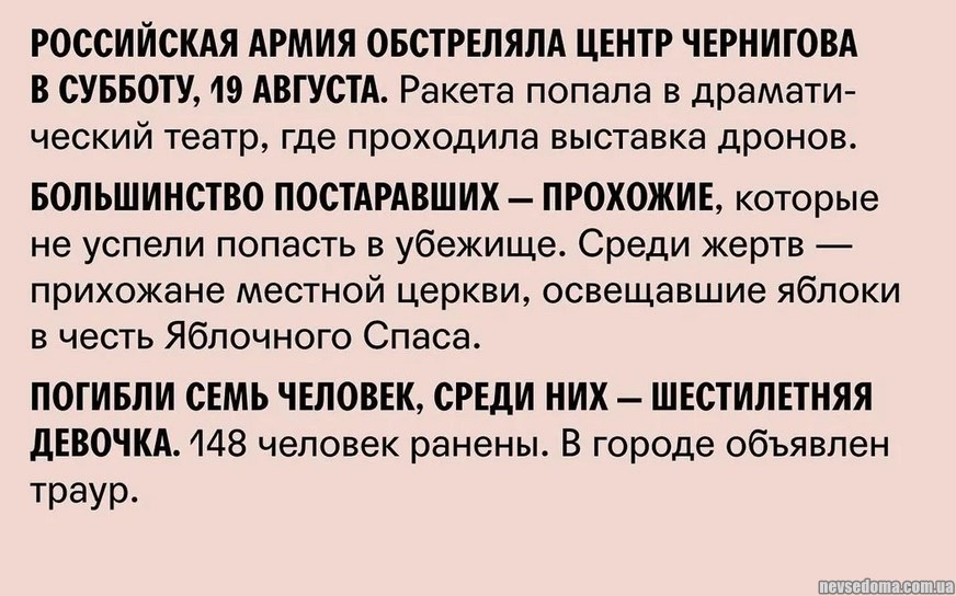 - Історія однієї родини, яка втратила близьку людину, після удару РФ по Чернігову. Загалом загинуло 7 людей, понад 140 постраждало