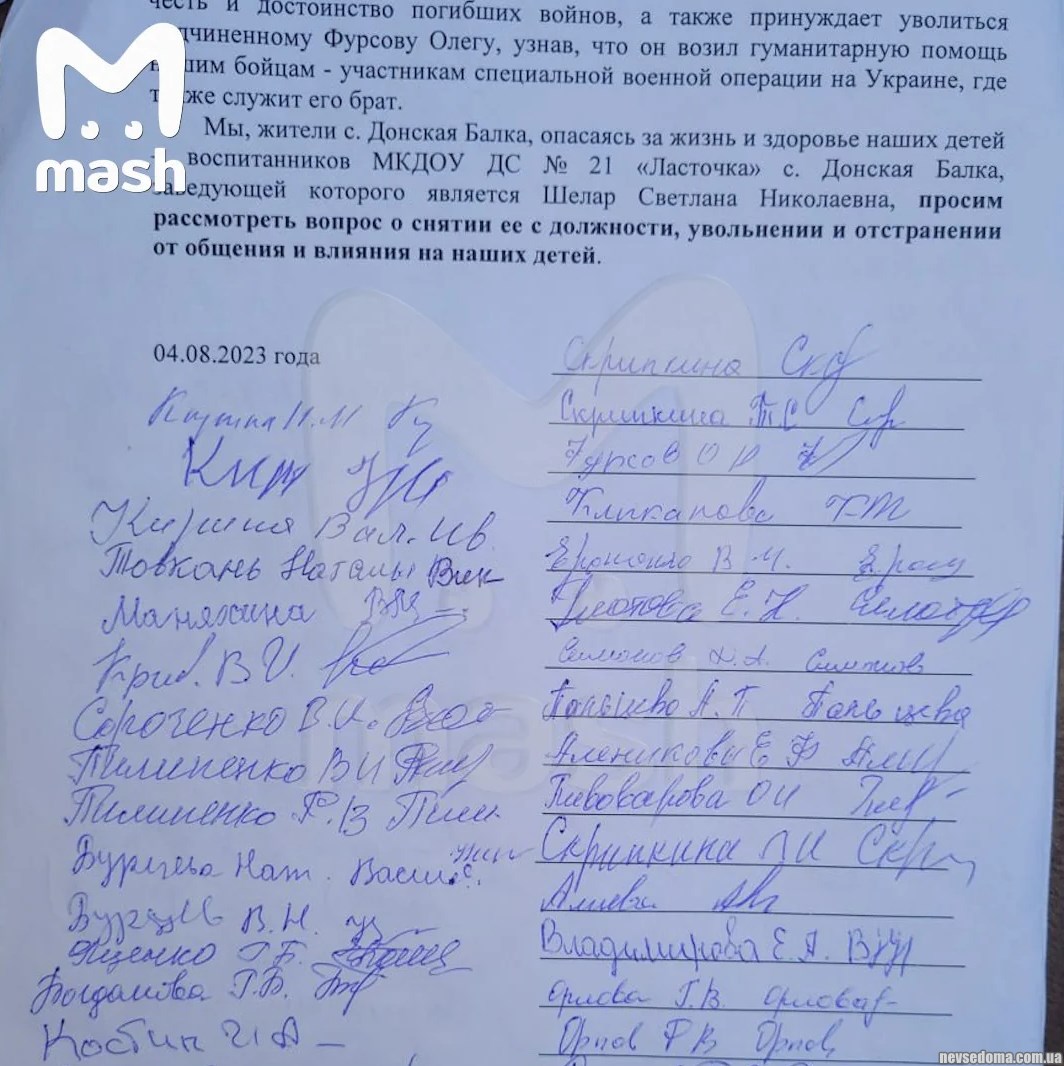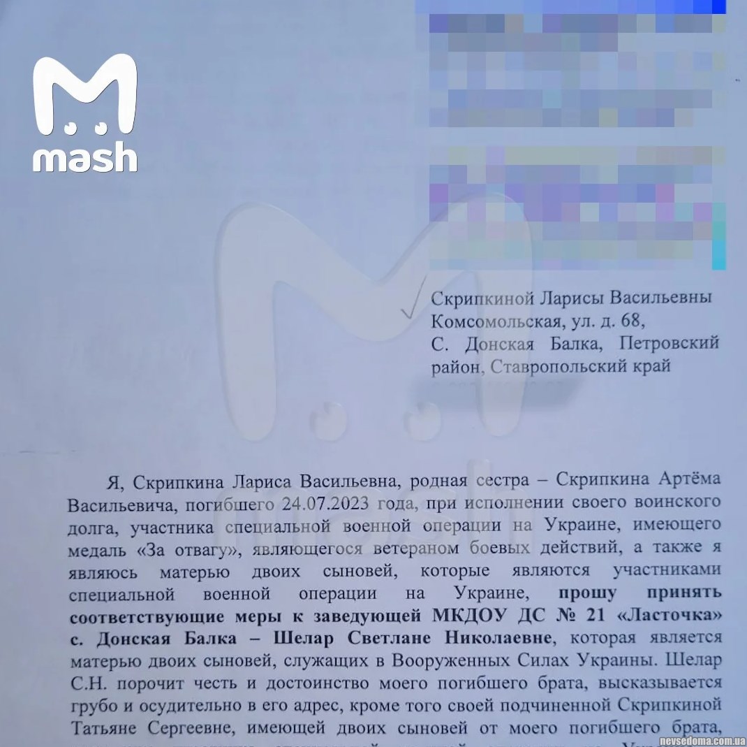 - З дитячого садка у ставропольському селі Донська балка після доносу видання Mash, співробітників та батьків звільнено завідувачку Світлану Шелар: вона не підтримувала війну з Україною