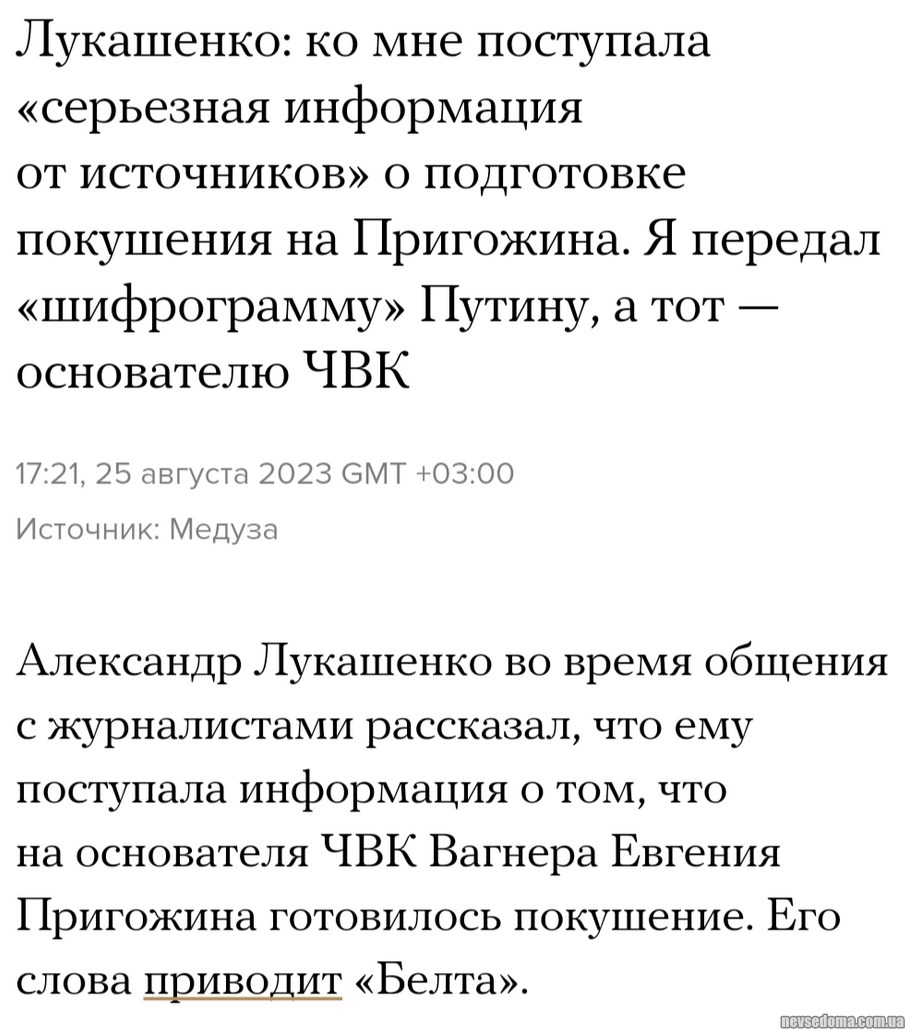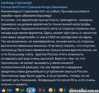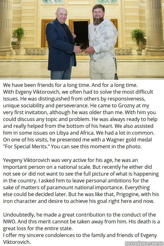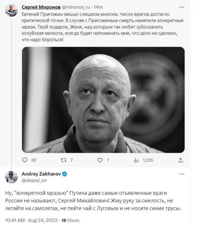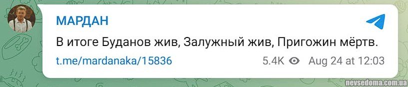 Всім зрозуміло, що ліквідували пригожину за наказом путіна. Бункерний не прощає зради, він убиває всіх, хто може нести хоч якусь небезпеку для його влади, Політковська, Нємцов, Березовський, Литвиненко та інші, включаючи отруєного та посадженого Навального.