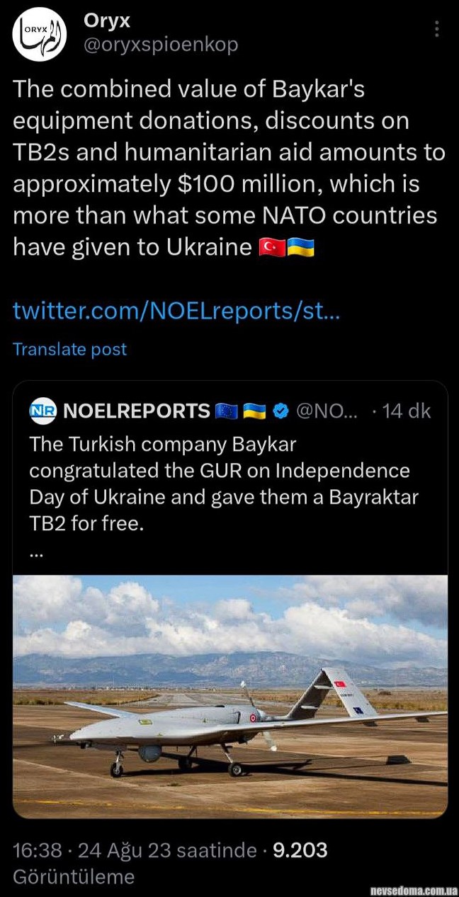 Компанія Baykar компанії Turkiye безкоштовно доставила до України БПЛА Bayraktar TB2 до Дня незалежності.