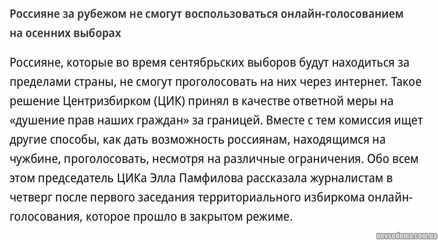 - Центрвиборчком фашистської Росії заборонив голосувати на виборах через інтернет росіянам, які перебувають за кордоном