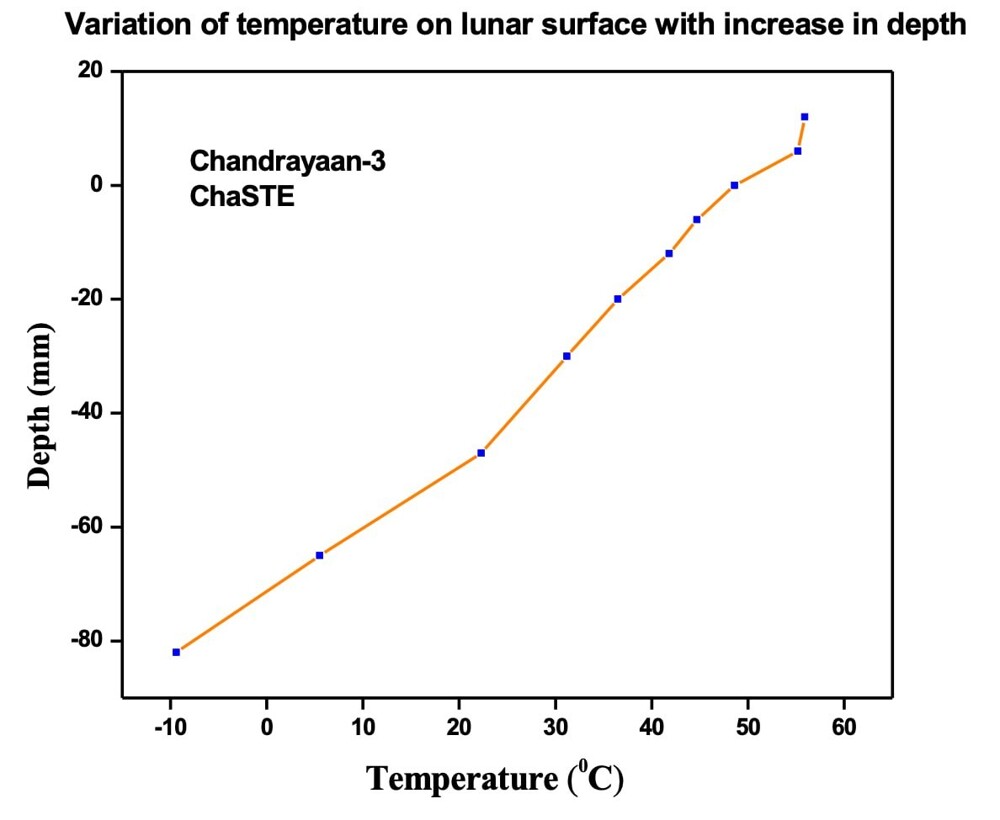 ISRO представила графік температур, на якому проілюстровано зміни температури місячної поверхні на різних глибини, зафіксовані зондом місяцехода.
