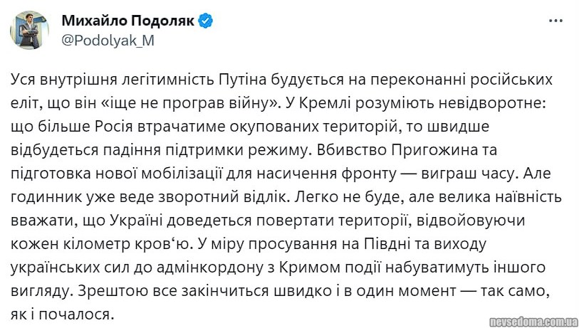 Нагадаю, ВСУ вже перетнули головну першу лінію оборони Росії. А Подоляк заявив, що ворожа армія – ndash; на межі остаточної втрати страт. позицій: наші просуваються на південь і наближаються до взяття під вогневий контроль сухопутного коридору в Крим.