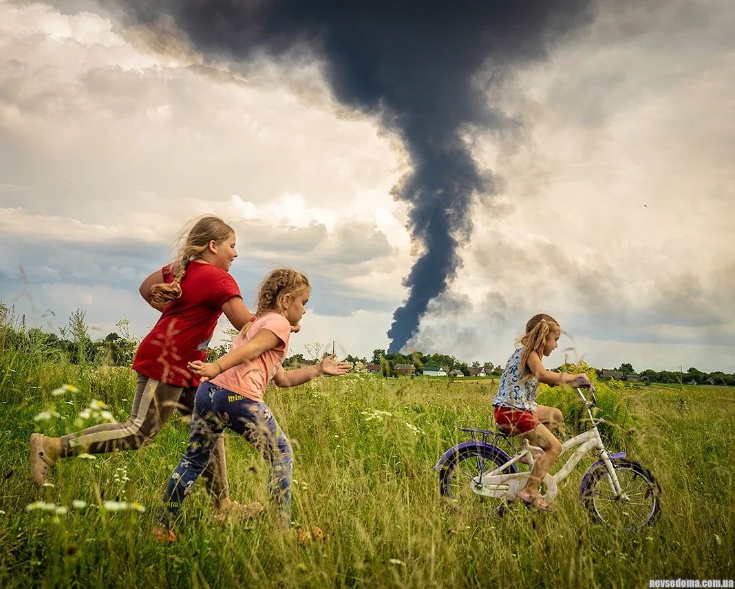 - Українські діти грають на тлі того, як російський безпілотник вразив ціль біля їхнього будинку.