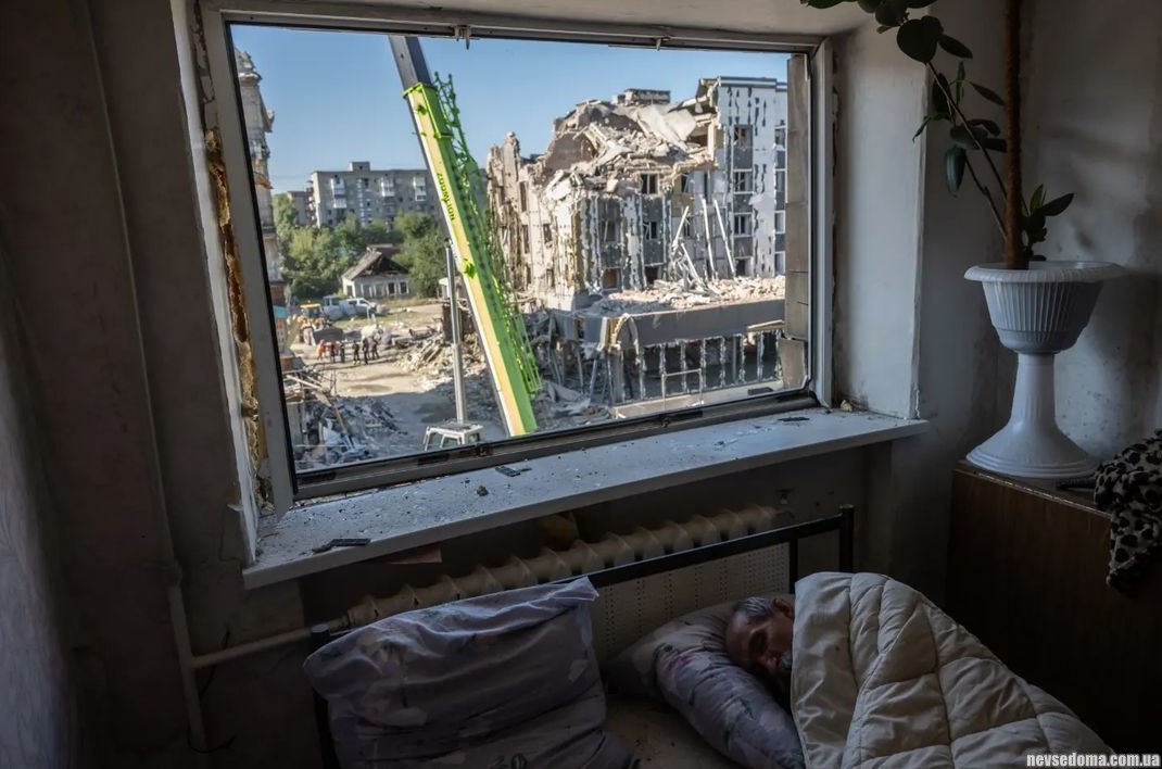 - 08.08 Покровськ, Донецька область. Чоловік відпочиває у своїй квартирі, доки за вікном рятувальники ліквідують наслідки російських обстрілів.