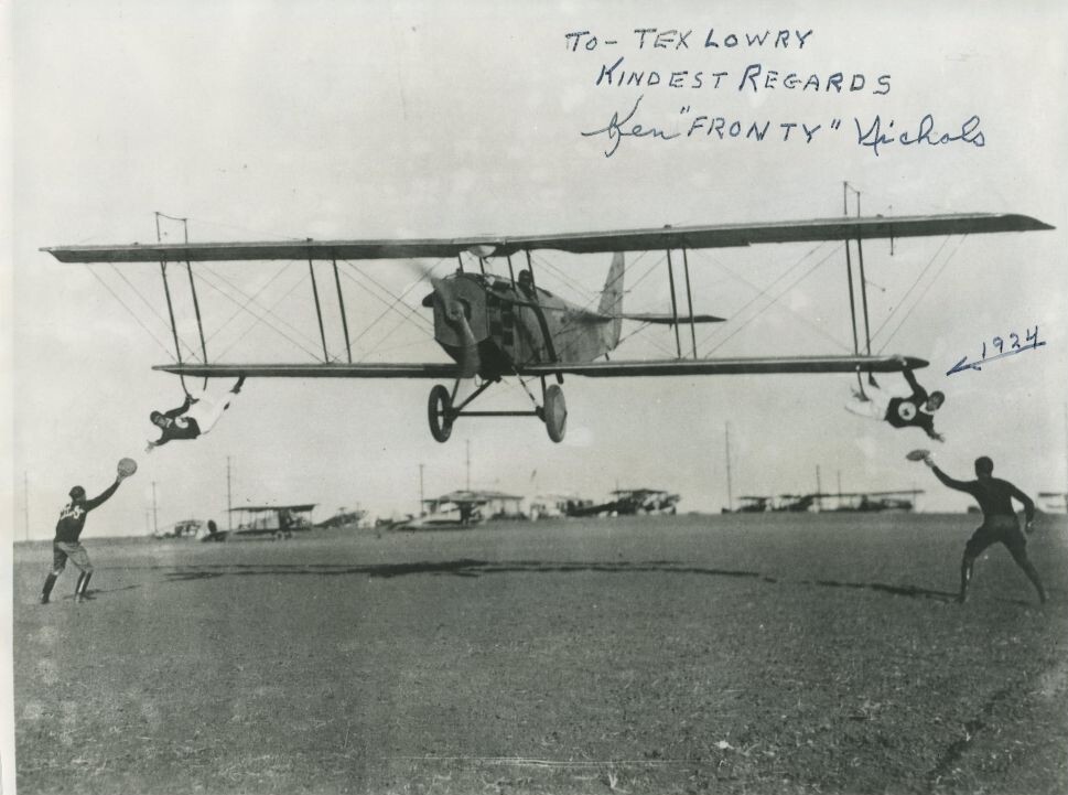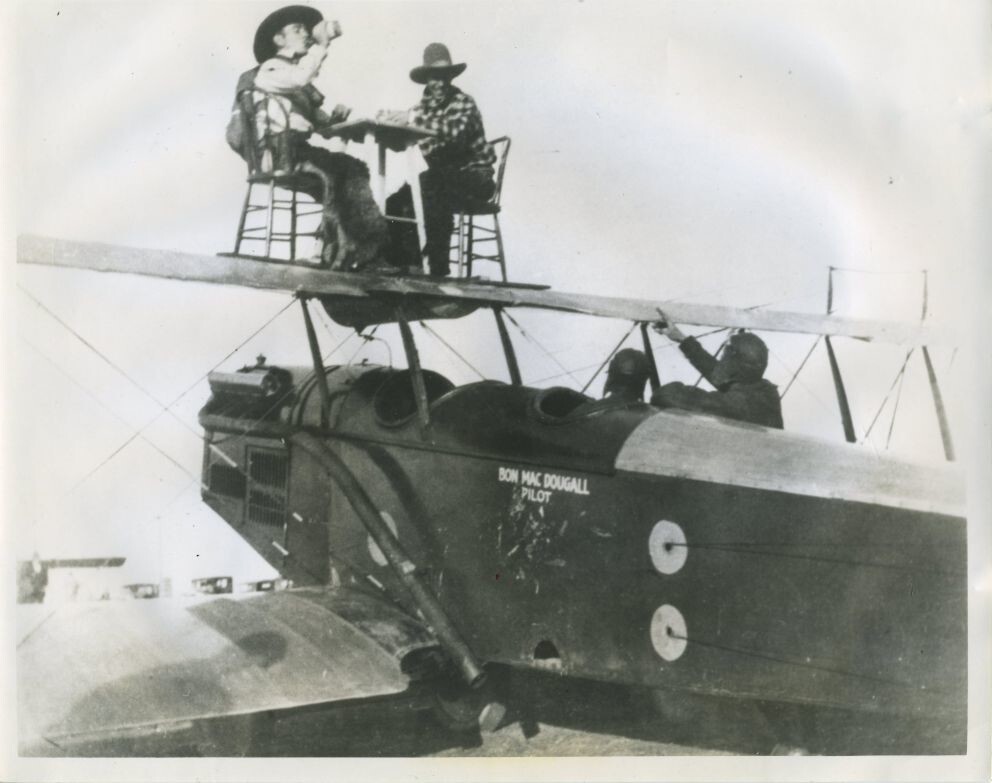 11. Поки Бон Макдугалл пілотує, двоє інших "котів" у ковбойських костюмах, Ел Джонсон і Кен Ніколс, грають у карти на верхньому крило літака. Фото 1925 року