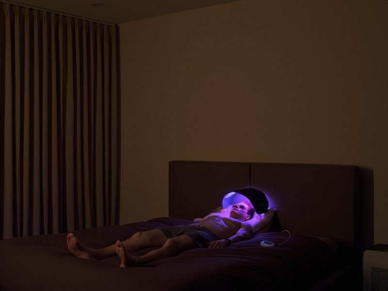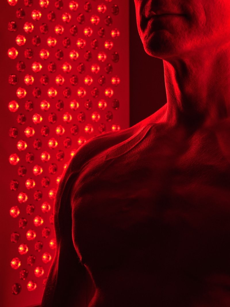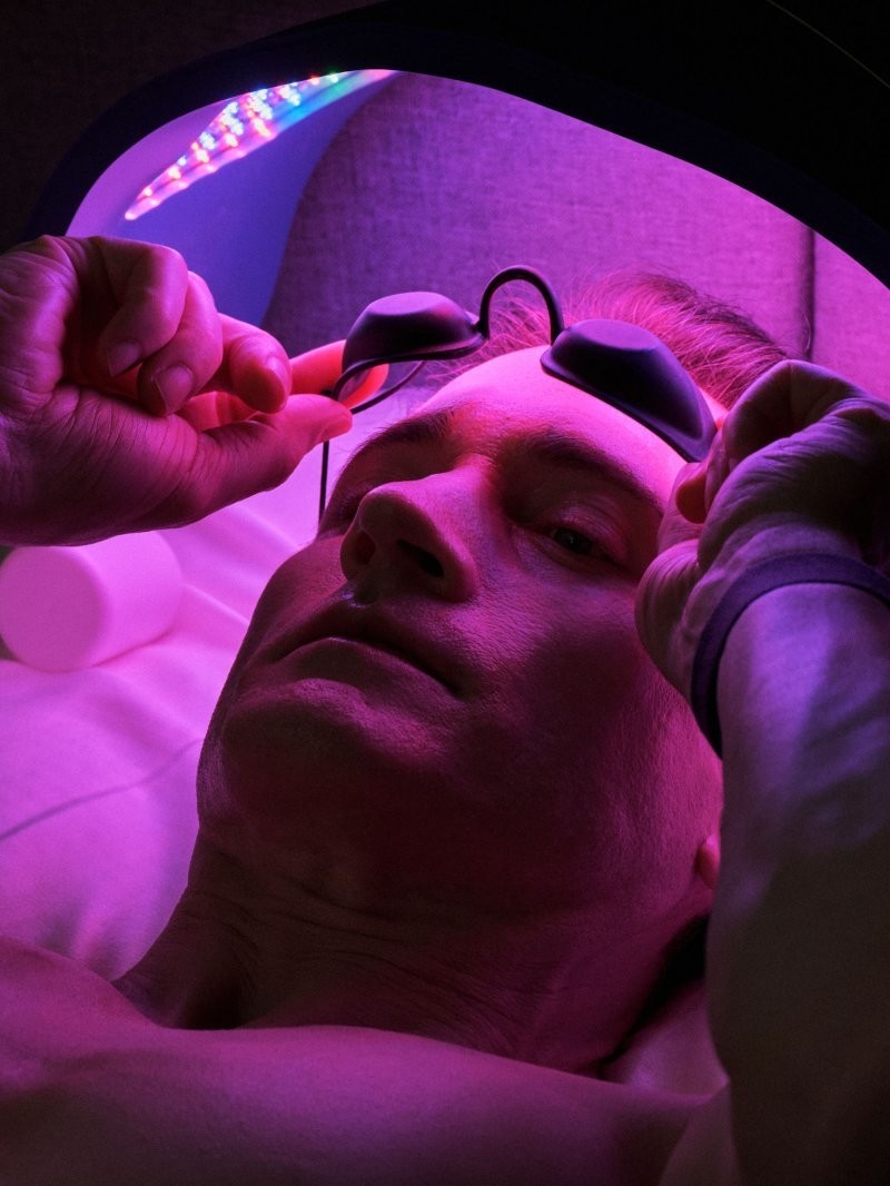 Джонсон стоїть перед апаратом для терапії інфрачервоним та червоним світлом