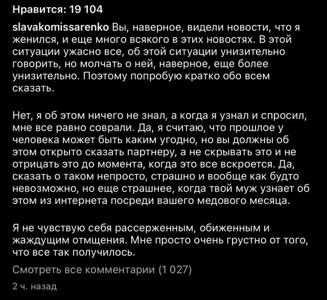 Нещодавно ми писали, що відомий комік Слава Комісаренко одружився на якійсь "загадковій" Юлії Шашковій. У Мережі про неї практично нічого невідомо, хіба що лише вік дівчини – 26 років. Але як говориться, той, хто шукає, той завжди знайде. Привід занервувати у Слави був, коли численні передплатники засумнівалися... у минулому панночки. Тому замість привітань комік читав лише коментарі з застереженнями. І в результаті шанувальники стендапера мали рацію і Комісаренко написав посаду, де зізнався, що його новоспечена дружина - вебкам-модель із чималою кількістю пластичних операцій.