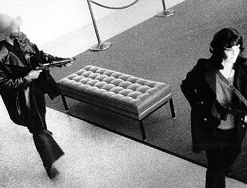 Патрісія Херст (праворуч) під конвоєм лідера С. А. О. Дональда Дефриза (ліворуч) бере участь у пограбуванні банку «Хібернія»