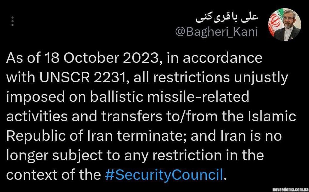 «З 18 жовтня 2023 року відповідно до резолюції 2231 РБ ООН знімаються всі обмеження, несправедливо накладені на діяльність, пов'язану з балістичними ракетами, та їх постачання до Ісламської Республіки Іран; та Іран більше не підлягає жодним обмеженням у контексті Ради Безпеки»