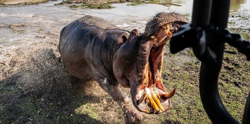 Бегемот кинувся на транспортний засіб, що видає загрозливі звуки, і прокусив бічні двері, тим самим надовго залишивши пам'ять туристам про зустріч із собою.