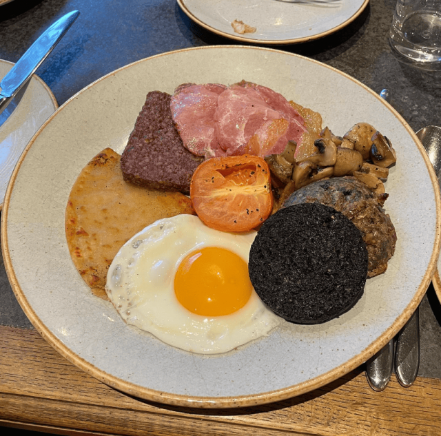В обов'язковому порядку включає баранячий рубець із яєчнею та квадратну ковбасу Лорна. Як добавки можуть використовуватися свіжі овочі та гриби.