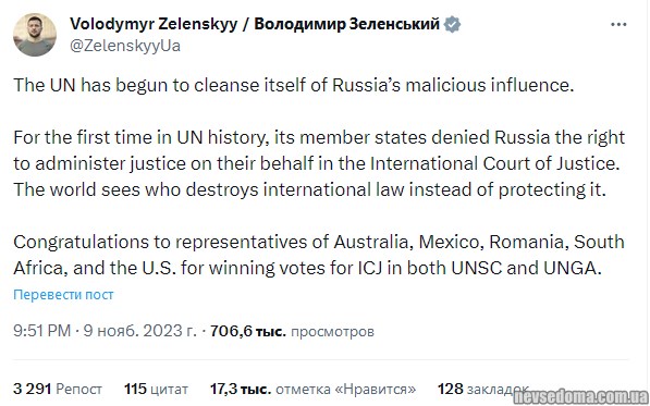 - Вперше в історії Росії не обрали до складу Міжнародного суду ООН, - Зеленський.