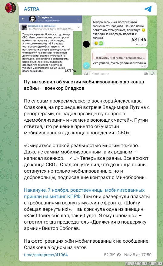 Слідом за Z-військором Сладковим, який послався на слова Путіна про те, що покликаних з мобілізації не повернуть до закінчення війни, про це заявила Анастасія Кашеварова.