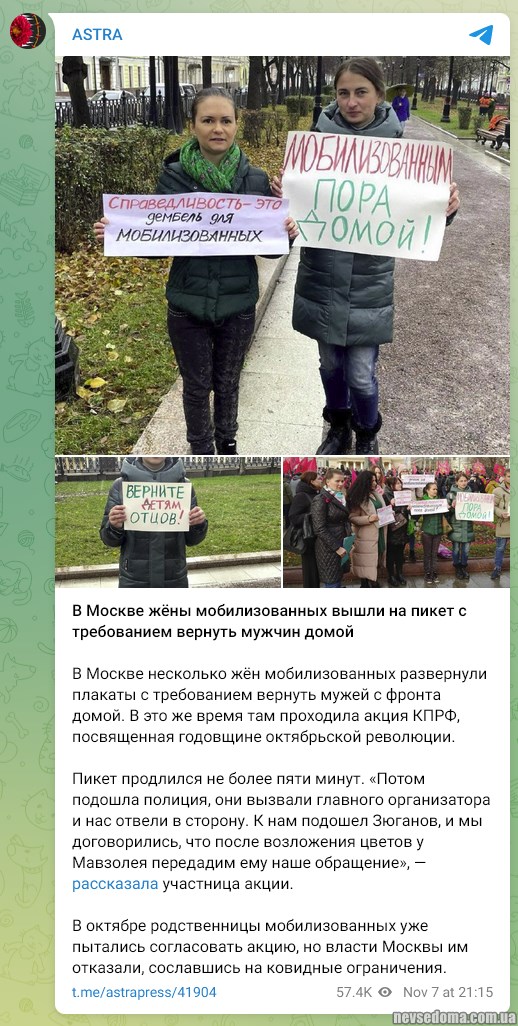 У 7 листопада дружини мобілізованих прийшли на мітинг КПРФ, присвячений роковинам Жовтневої революції. Там вони розгорнули плакати з вимогами повернути мобілізованих із фронту.