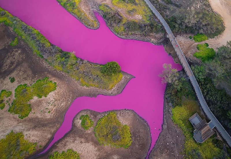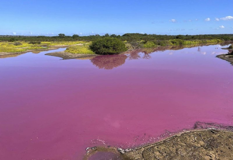 Ставок у Національному заповіднику дикої природи «Кеалія» на гавайському острові Мауї забарвився у яскраво-рожевий колір через збільшення вмісту солі у воді після сильної посухи.