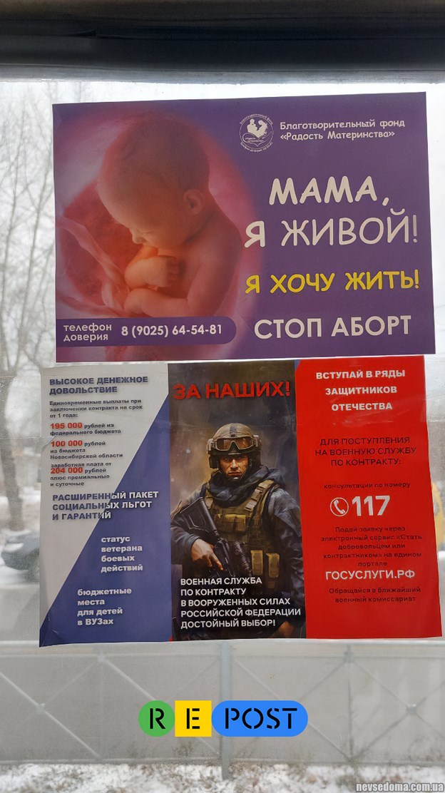 - У Новосибірську плакат проти абортів «Хочу жити!» повісили поруч із набором на військову службу за контрактом.
