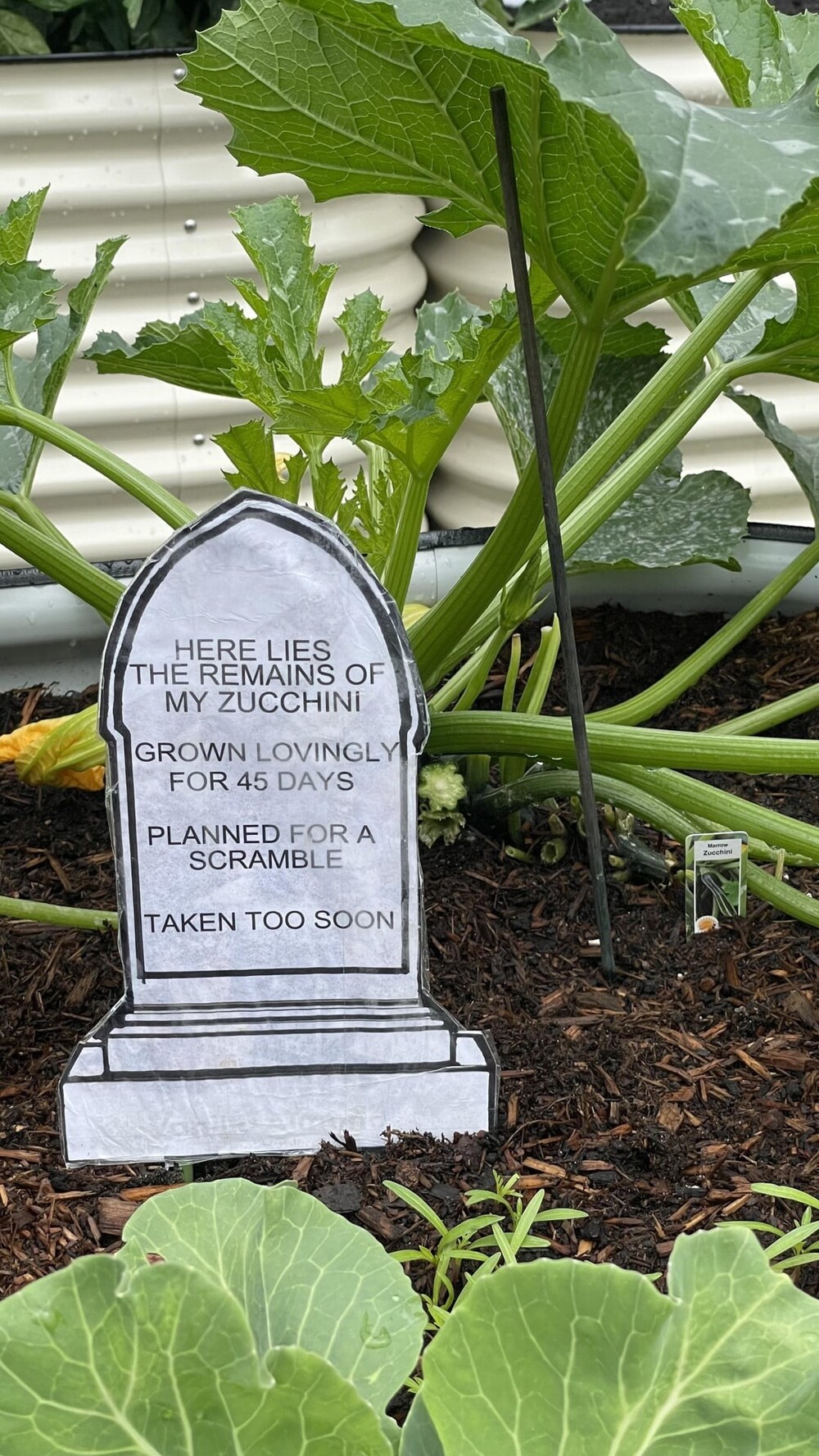 "Тут спочивають останки цукіні. 45 днів вирощували його з любов'ю. Мав опинитися в овочевому омлеті. Його не стало занадто рано".