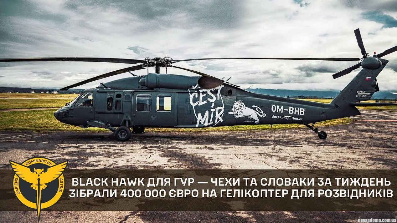 - Вертоліт Black Hawk для української військової розвідки (ГУР) - чехи та словаки за тиждень зібрали 400 тисяч євро на вертоліт для розвідників.