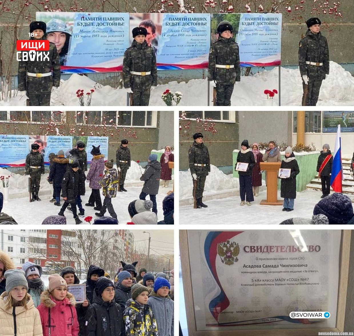 5-А клас школи №47 у Пермі тепер офіційно носить ім'я «героя СВО Асадова Самада Чингізовича». Він загинув у січні під Бахмутом. Звичайно ж, «герой» був кримінальним злочином і відбував термін за 228-ю наркотичною статтею.