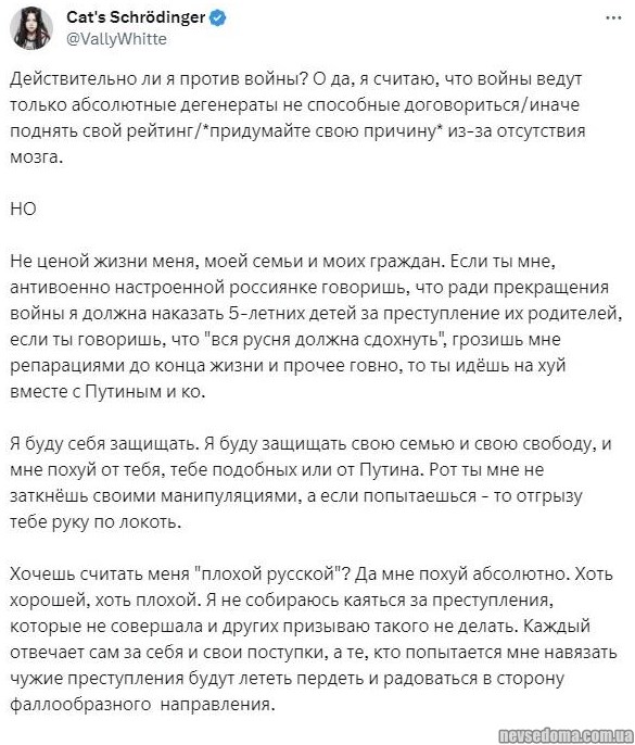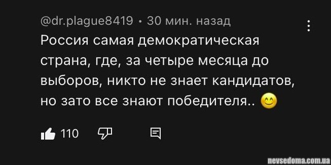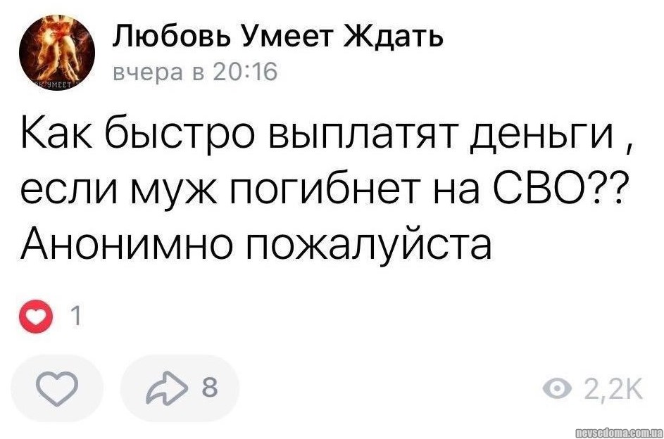 2024-й президент оголосив роком сім'ї. Іронічно, враховуючи, що дружини виють без чоловіків, діти ростуть без батьків, а багато хто вже залишився сиротами. А сатаніст-людожер, який скоїв рецидив після першого ув'язнення, виходить на волю через півроку, спокутувавши серійні вбивства на СВО. Є все ж таки почуття гумору у нашого президента! <…> Мабуть, нашу з вами Батьківщину звільняють для вершків суспільства: маніяків, алкашів, мігрантів, непомірно багатих чиновників та їхніх діточок (чому вони не в окопах, до речі?)