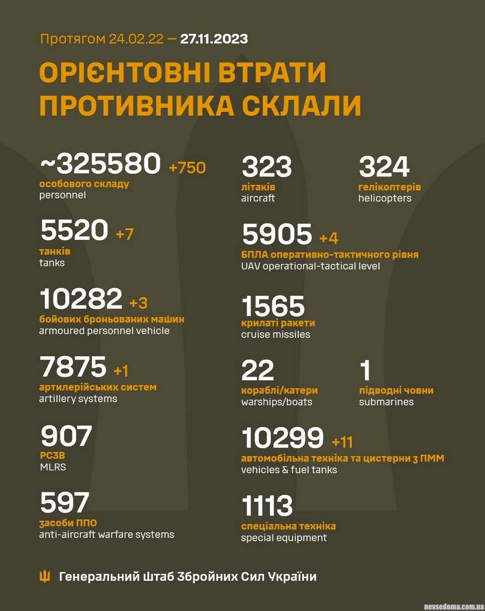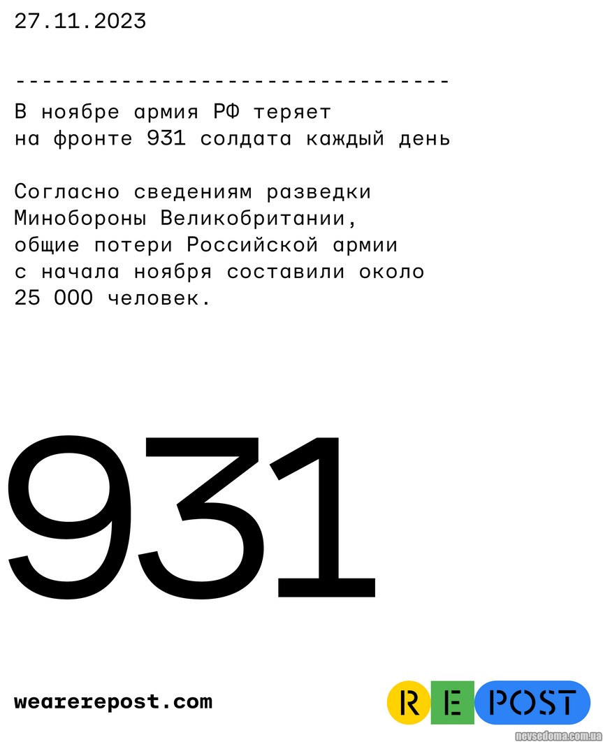 - У листопаді армія РФ втрачає на фронті 931 солдата щодня